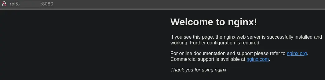 Browsing to the RaspberryPi on port 8080 we are presented with the familar default nginx page